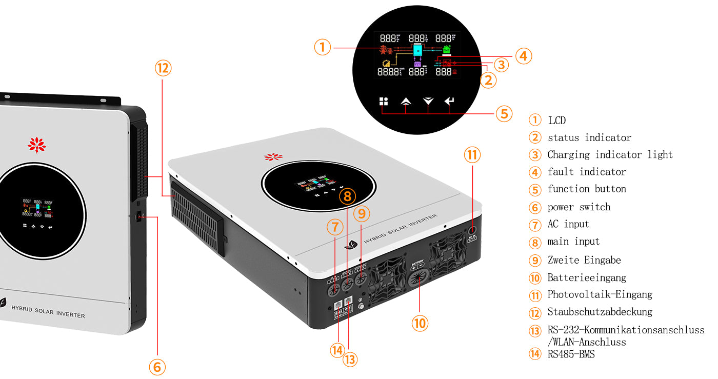 Das Gerät arbeitet mit 48VDC Niederspannungsbatterien (Lithium, LiFePO₄, Blei-Säure) und unterstützt bis zu 120A Solar- und 100A Netzladung.