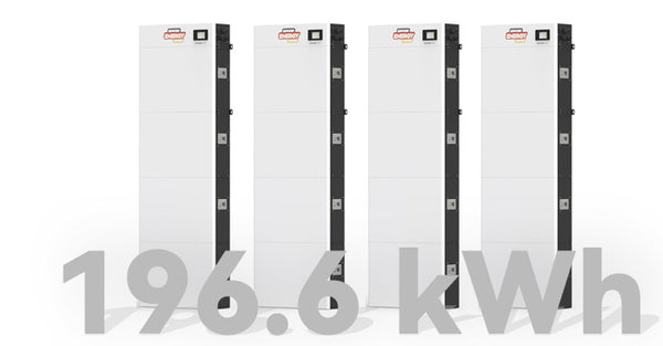 Pro Steuerbox-Gruppe bis zu 4 Module (49.12 kWh). Bis zu 4 Gruppen sind parallel möglich, insgesamt bis zu 196.6 kWh Speicherkapazität.