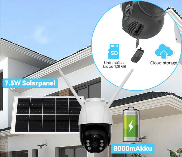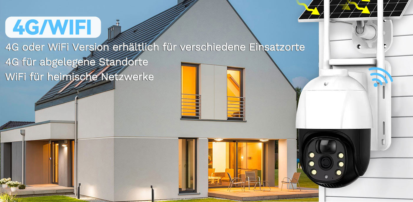 Die WSA-Q9 kombiniert modernste 2MP Solar-Überwachung mit wahlweise 4G- oder WiFi-Anbindung und einem langlebigen 8000 mAh Akku. Dank 7,5 W Solarpanel liefert die Kamera zuverlässige Energie für Tag- und Nachtüberwachung, intelligente Bewegungs- und Humanoiderkennung sowie Fernzugriff über die V380-Pro App. Perfekt für Hof, Garten oder Einfahrt, bietet sie klare Videoaufnahmen, Zwei-Wege-Audio und stabile Cloud- oder TF-Kartenspeicherung bis zu 128 GB.