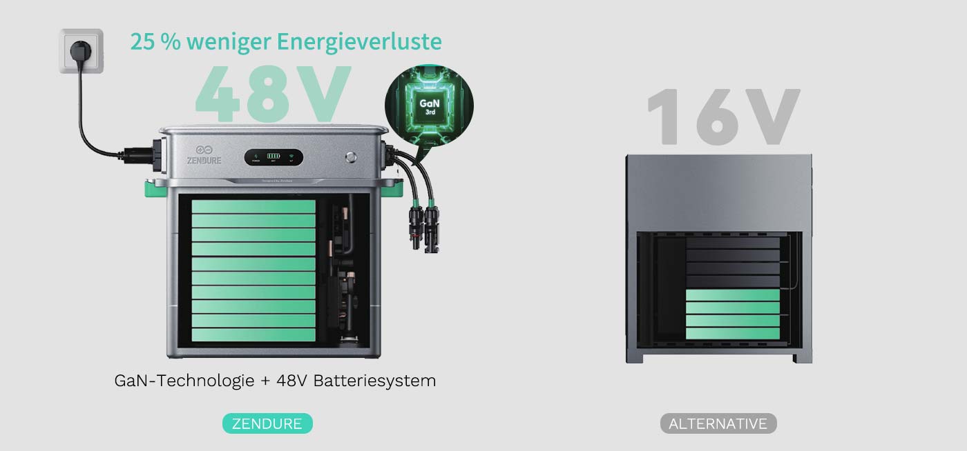 Der SolarFlow 800 Pro ist mit einer 48V-Batterie ausgestattet und reduziert Energieverluste um 25 % im Vergleich zu einem 16V-System. Dank seiner fortschrittlichen, DC-gekoppelten Architektur erreicht derSolarFlow 800 Pro eine Energieeffizienz von bis zu 96 %*. Energie zu sparen war noch nie so einfach.