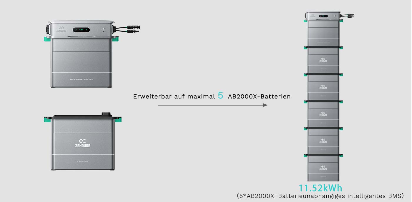 Bis zu 6 Batterien stapelbar (max. 11,52 kWh). Bis zu 3 Systeme können zu einem 3-Phasen-System kombiniert werden.